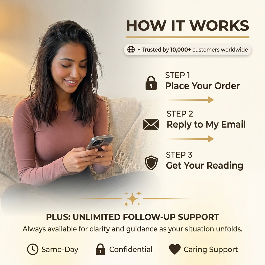 Your satisfaction is my priority. If you feel your order did not provide the clarity or guidance you were looking for, reach out and I will make it right. I may offer additional guidance, clarification, or a supplementary reading at no charge. In cases where satisfaction still cannot be achieved, a partial or full refund will be considered. In over 10 years of practice, fewer than 0.5% of clients have ever needed to use this. You are in good hands. T&C apply.